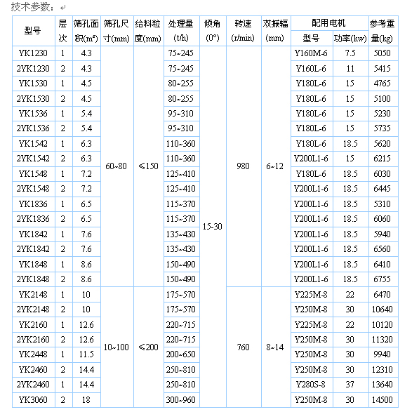 1、YK型塊偏心圓振動篩系YA型軸偏心圓振動篩的更新?lián)Q代產(chǎn)品,有20個定型規(guī)格并分別有敞開型和封閉型兩種結(jié)構(gòu)形式。本系列振動篩有輕型和重型之分,適用不同物料粒度級別的篩分,選用時請確定電壓制式及有無防爆要求;