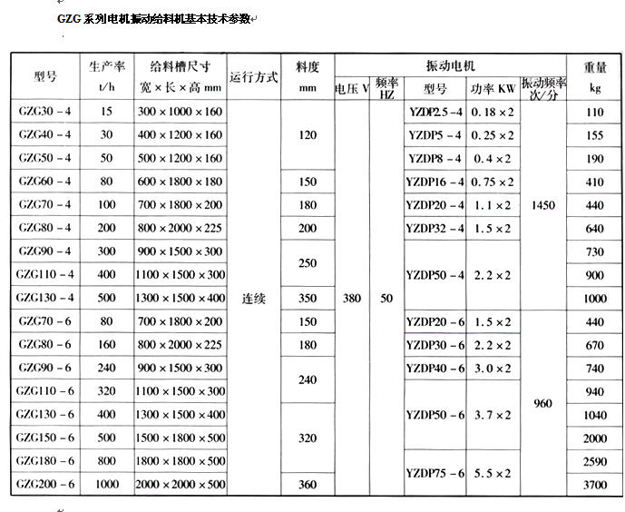 GZG系列電機振動給料機基本技術(shù)參數(shù)