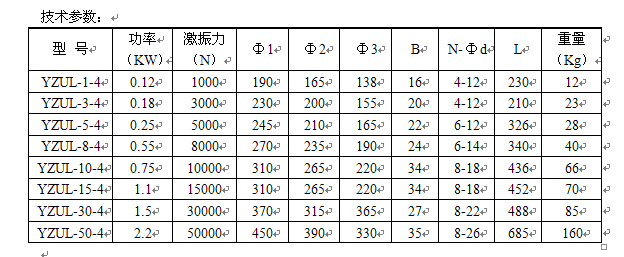 YZUL系列立式振動(dòng)電機(jī)技術(shù)參數(shù):